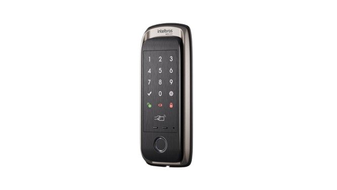 Fechadura Digital de Sobrepor Sua casa mais prática com liberação de acesso remoto e conectividade com eletroeletrônicos e lâmpadas através do app Mibo. » Até 15 senhas de acesso com o aplicativo Mibo e 9 senhas sem o uso do aplicativo. » Cadastro de até 100 biometrias. » Cadastro de até 100 tags. » Gerenciamento remoto de acessos em tempo real pelo aplicativo Mibo. » Fechadura de sobrepor para portas pivotantes e de correr de 25 a 60 mm de espessura. » Alimentação por 4 pilhas AA que acompanham o produto, com duração média de 10 meses. » Travamento automático » 4 anos de garantia com a intelbras