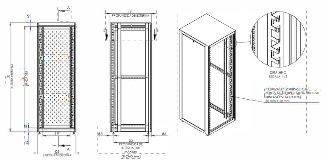 Rack de Servidor com estrutura monobloco soldada. Acomodação de equipamentos de Tl de padrao 19", 21'" e 23'". 0 Rack é provido de 4 guias verticais na propria estrutura, facilitando o acesso ao cabemaneto estruturado e economizando espaço interno útil do Rack. Capacidade de carga estatica: 450 Kg.