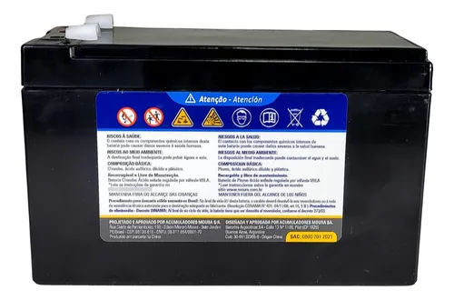 Descrições São produzidas na América do Sul, com tecnologia de placa laminada aumentando a robustez contra corrosão da grade. Com uma excelente aceitação de carga capaz de suportar picos de descarga, eleva a confiabilidade do sistema onde aplicada. - Eletrólito imobilizado no separador AGM, permite que a bateria seja instalada em diversas posições. - Eficiência de 99,9% de recombinação dos gases, reduzindo a perda de água e aumentando a vida útil em operação. - Baixa auto descarga, com menor manutenção de estoque. - Produzida sob regime mundial de qualidade. Livre de manutenção Características Gerais: Tensão Nominal: 12 Volts Temperatura de Referência 25°C Temperatura Máxima de trabalho: Máx: 50°C Temperatura Mínima de trabalho: Mín: -15°C Especificações Ténicas: Modelo da bateria: 12MVA-7 Vida útil (anos) : 5 Capacidade: (Ah/25°C): 7Ah Dimensões (mm): Comprimento: 151, Largura: 65, Altura: 94, Altura Total: 98 Peso aproximado (kg): 2,1 Resistência Interna: 30 Máxima Corrente de Descarga: 105 Tensão de Recarga: Tensão de ciclagem: 2,45 (-4mV/°C), Tensão de Flutuação: 2.27 (-3mV/°C) Corrente de recarga máxima: 2.1 A